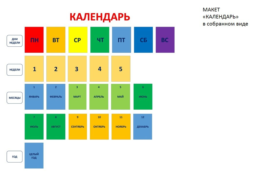В качестве модели календаря Фаина Николаевна Блехер предлагает изготовить коробку с отделениями по размеру листков отрывного календаря. В ячейки нижнего ряда дети будут каждый день складывать последовательно снятые листки – дни недели. По окончании недели листки из нижнего ряда собираются вместе и стопочкой кладутся в первое отделение второго ряда – прошла 1 неделя и т.д. до конца месяца, затем подобным образом собирается месяц, и как итог – год.